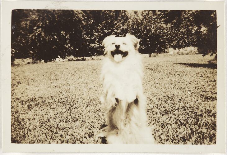 Black and white photograph of Skipper, a Pomeranian crossbreed dog, sitting on his hind legs, 'begging', in the garden area of the Kodak Australasia Pty Ltd factory site in Abbotsford, in the early 1940s. This photograph highlights the intersection between the domestic and the industrial that occured at this site around World War II, which was an unusual and unique experience in Kodak's manufacturing history.