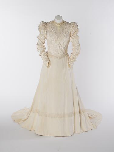 Two piece wedding dress, consisting of a fitted jacket and separate long skirt: (1) Jacket made of a cream satin material, machine sewn, with clear net inserts creating a floral design. Underneath is a layer of a cream synthetic material. Inserted around the collar and v-shaped neck area are panels of a cream machine lace, pleated towards the bottom, and is edged with a wide panel of thick machine lace. The neck opening is decorated with yellow ribbon tied in a bow at the front. It has leg of mutton sleeves, decorated near the shoulder area with four pleats. The cuffs are ruched and decorated with yellow ribbon. The jacket opens down the centre back, and is secured with a row of metal hook and eyes. A row of machine lace decorates the outside of the waist area, and inside are a row of metals eyes to attach the jacket to the skirt. There is synthetic boning and a white cloth label sewn inside the jacket. (2) Long flared skirt made of panels of a cream material, machine sewn, decorated towards the bottom with a row of a wide machine lace. There is a small opening at the back, which is secured with a row of metal press studs and two pieces of white cloth tape. There are lengths of cloth tape sewn inside for attaching to undergarments (not present). There is a small cloth loop sewn into the back hem of the skirt to be hung around the thumb of the wearer so that the skirt does not drag along the ground. A cloth label is sewn into the hem of the skirt.
