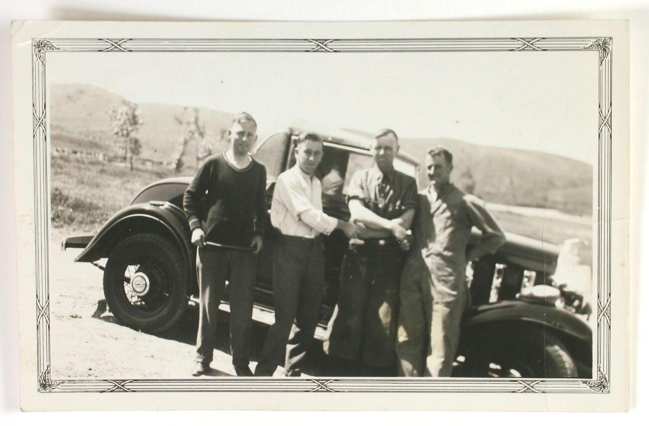 Rectangular black and white photograph of four men in front of a car, with a decorative printed border.