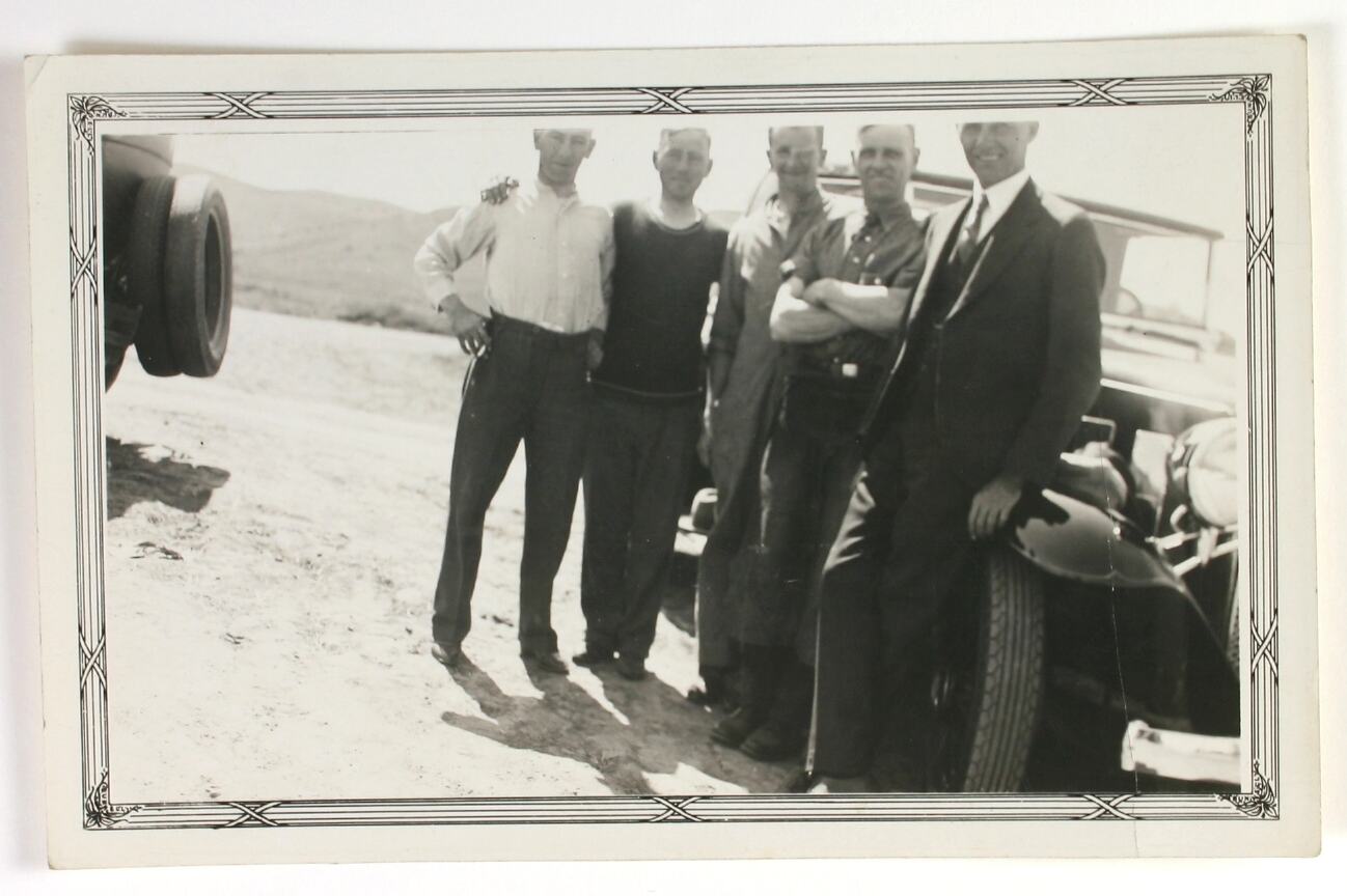 Rectangular black and white photograph of five men in front of a car, with a decorative printed border.