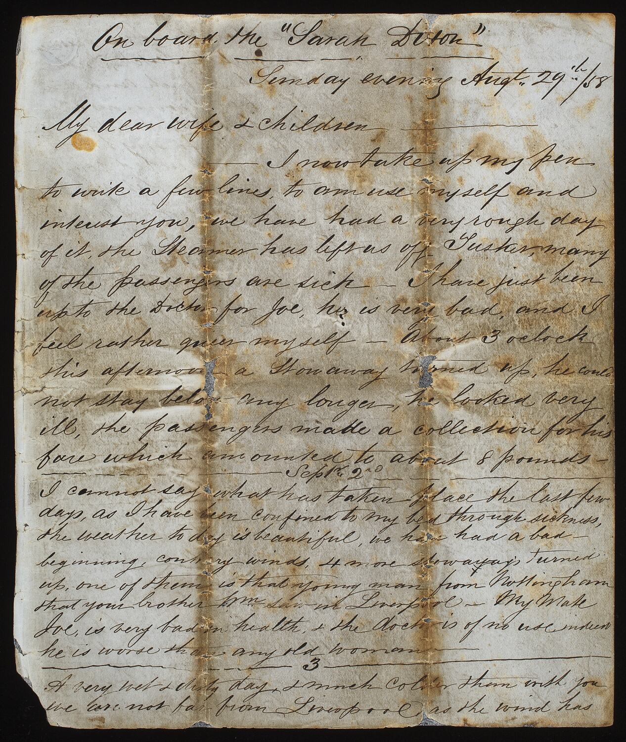 Header title: 'On board the "Sarah Dixon", with the first entry entitle: "Sunday evening Augt 29th /58 / My dear wife & children..." Signed: "Walter Dutton"