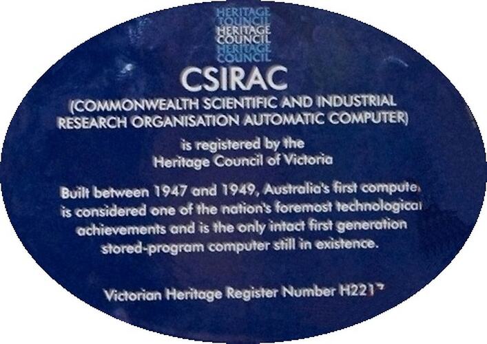 Plaque recognising the significance of the CSIRAC Computer, awarded by the Heritage Council of Victoria on 18 November 2009.