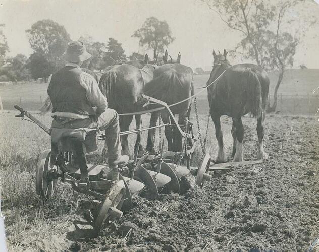 Handwritten in pencil on back, 'Ploughing 1920 style / WITH 3 FURROW M/B PLOUGH'