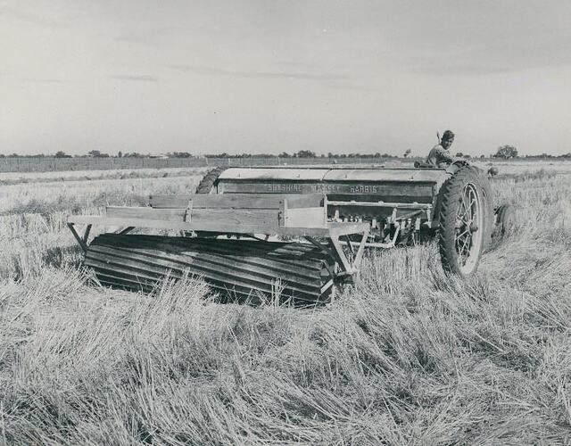Photograph of land roller and Seed Drill, Image is part of a collection of photographs, moving film, artefacts, documents and trade literature relating to Massey Ferguson (Aust.) Ltd (and earlier related companies) agricultural implement manufacturer, importer and distributor, Sunshine, Victoria.