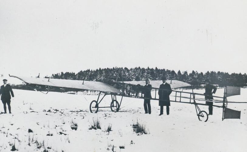 Photograph of Ferguson Monoplane on snowy field. Four men look on. Note that this plane is different from others in this collection as it only has two wheels at the front and has a rear tail wheel. It also has no fuselage cladding