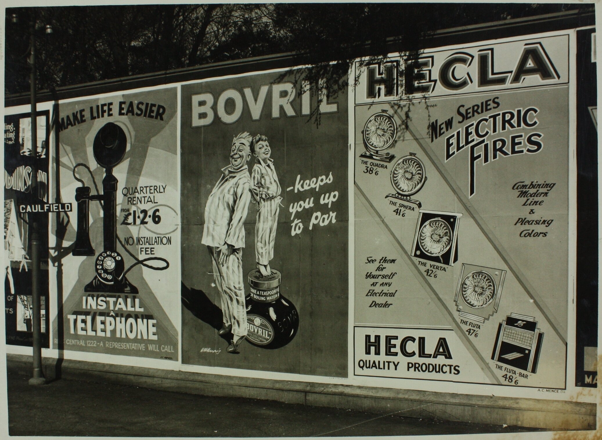Black and white photograph of billboard posters on the platform at Caulfield Railway Station in Melbourne, circa 1940. The posters are advertising telephone installation, Bovril, and Hecla Electrics Pty Ltd new series of 'electric fires'. The models of electric fires featured are 'Quadra', 'Sphera', 'Verta', 'Fluta' and the 'Fluta-Bar', and prices are included in the poster. The designs mark Hecla's shift into a more modern and streamlined style.