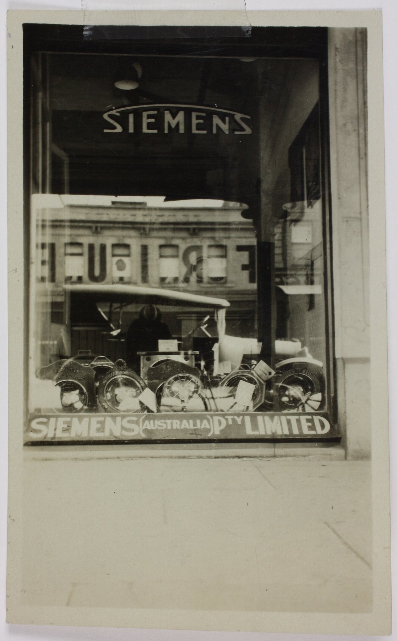Black and white photograph of a Siemens shopfront window featuring a display of heaters. There is a sign in the window and a reflection of the street and a car is visible. Reflected are the letters 'F.R.I.U.E' on a building across the road.