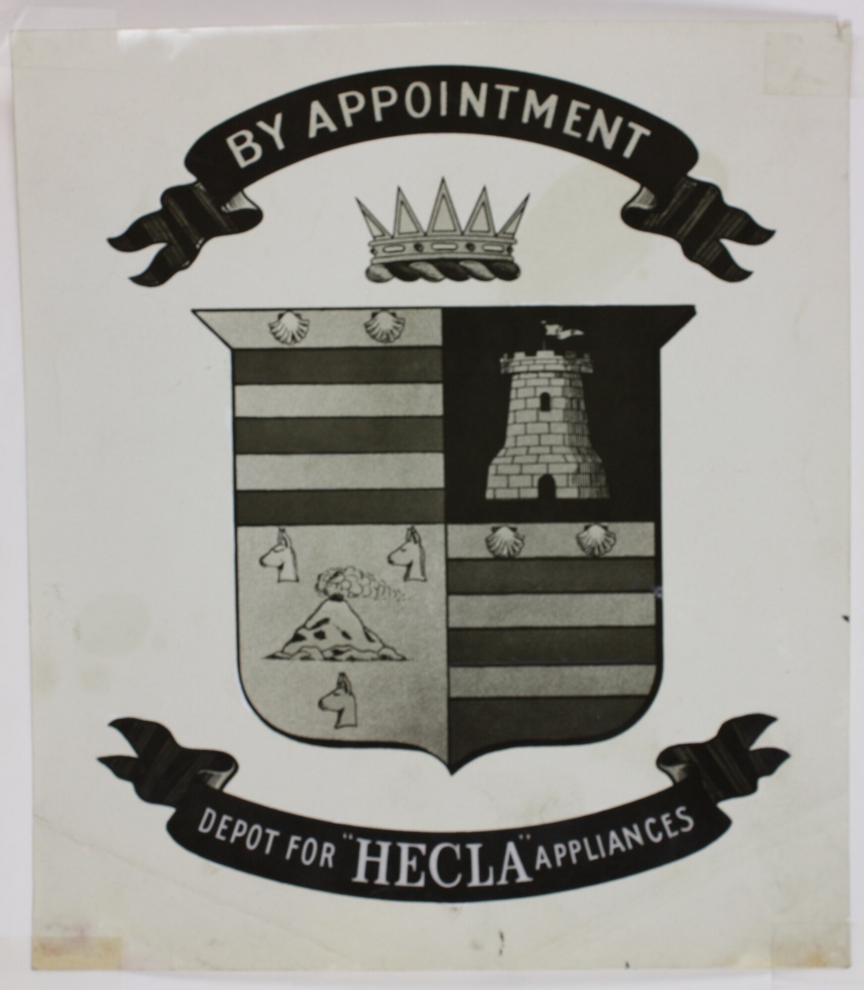 Front written across ribbon band on shield, 'BY APPOINTMENT / DEPOT FOR "HECLA" APPLIANCES'