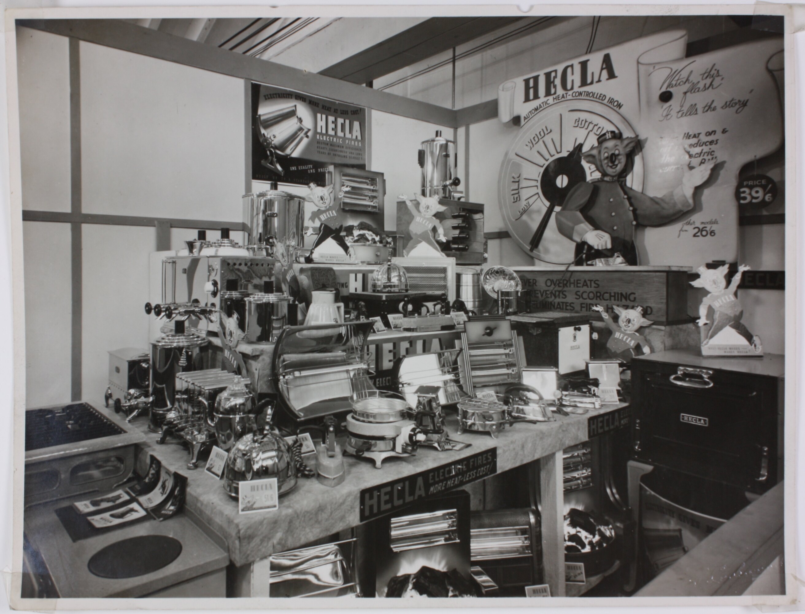 Hecla Electrics manufactured and distributed a wide range of domestic and commercial electric appliances products to Australasia, such as heaters, kettles, toasters, stoves and water heaters. Its client base included households, commercial businesses such as cafés, hospitals and offices, as well as the military. The company promoted its goods through advertisements in home magazines and displays in shop windows, home shows and the 1935 All-Electricity Exhibition. Hecla Electrics became a household name in Melbourne during the 1920s and remained a popular Australian brand until the late 20th century.'