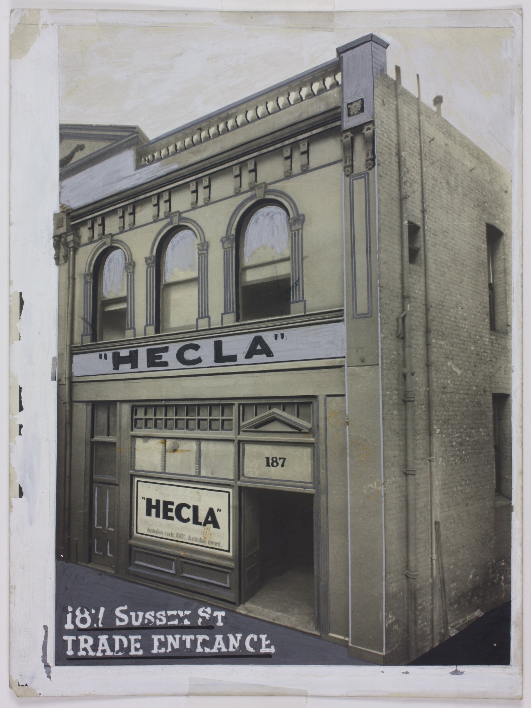 Black and white photograph of the exterior of Hecla shop at 187 Sussex Street, Coburg. Photograph is touched up with white and silver paint.