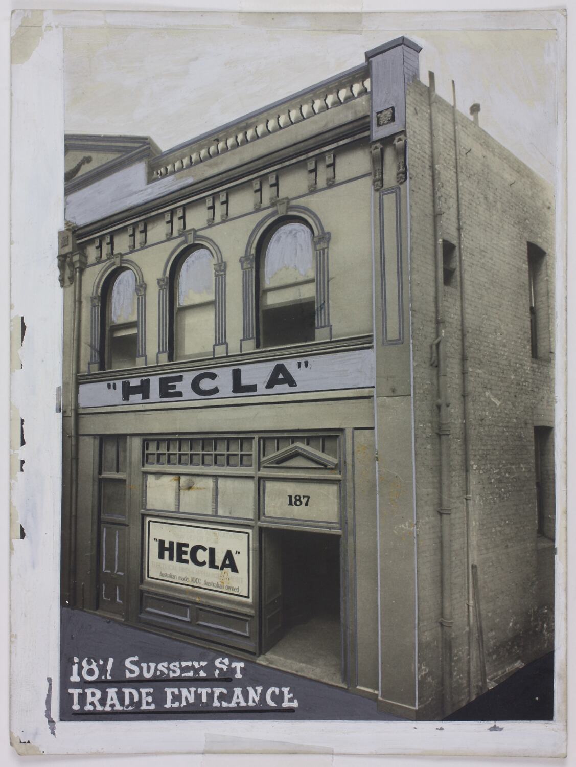 Front, bottom, left hand side, white ink/paint with black underline: '187 SUSSEX STREET / TRADE ENTRANCE'