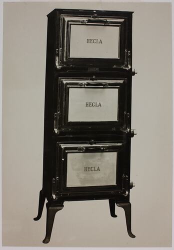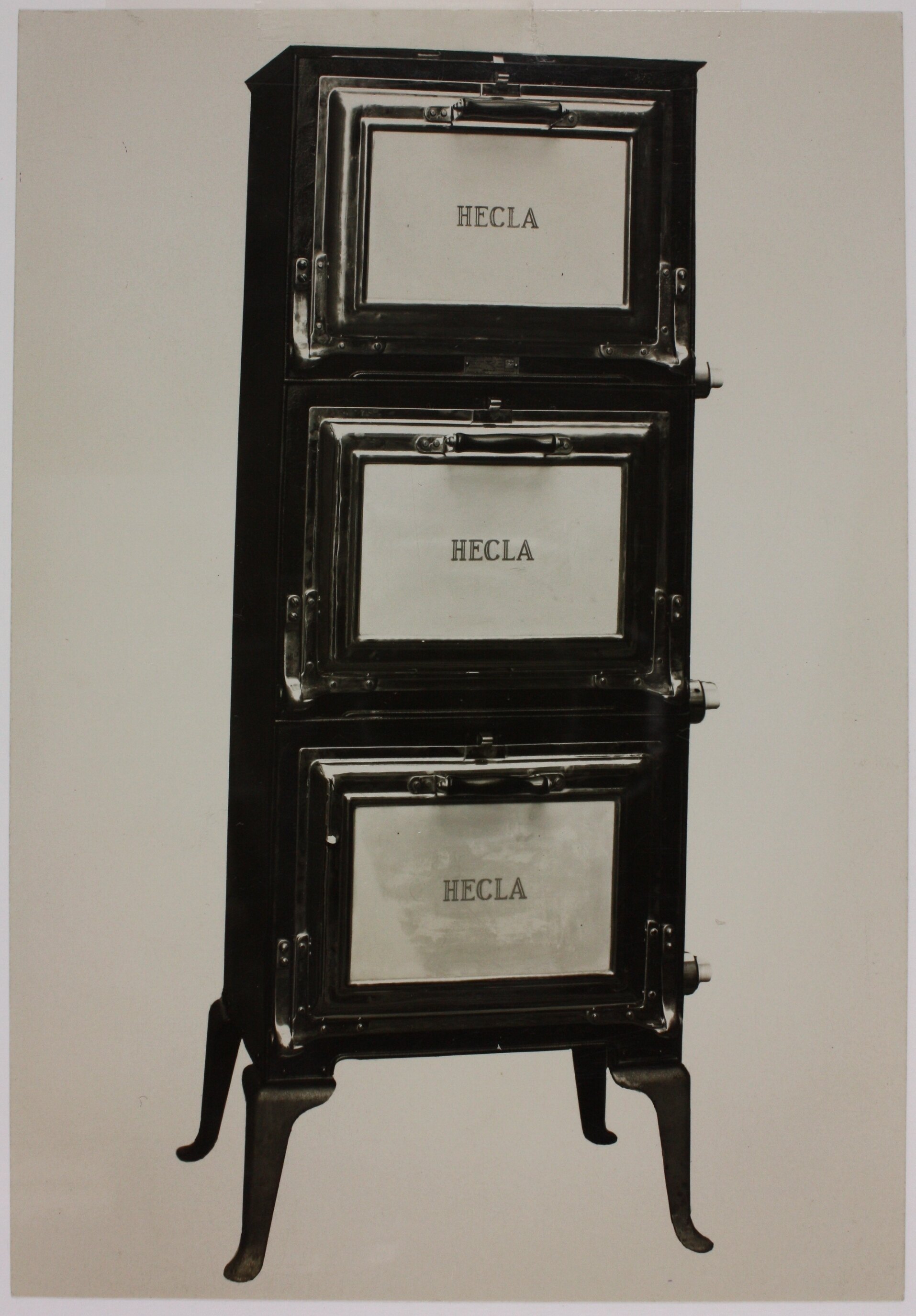 Black and white photograph of three level Hecla pastry oven, circa 1930s.