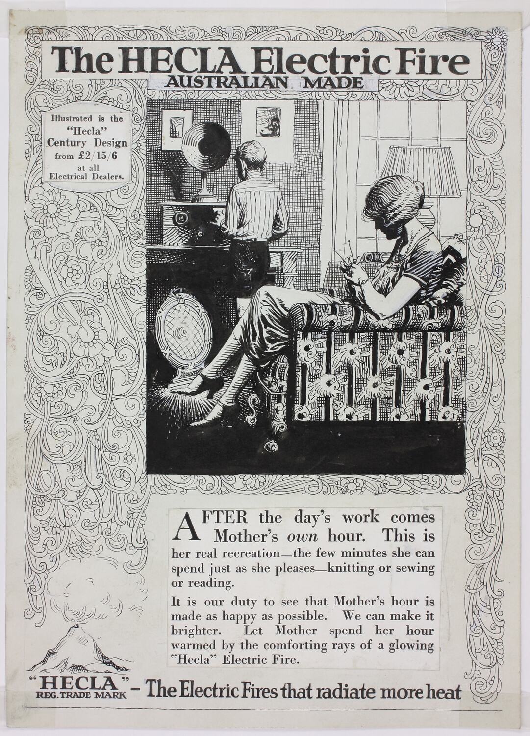 Pen and ink mock-up of advertisement for Hecla Electrics Pty Ltd electric heater, with the Hecla volcano logo in the bottom left hand corner circa 1920s. The heat from its lava was meant to signify the heat flowing from Hecla electric radiators.The Hecla volcano trademark originated when in 1916 Mount Hecla in Iceland erupted making world news.