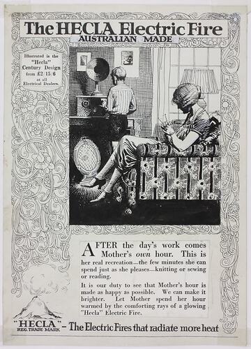 Top, centre, black ink: 'The HECLA Electric Fire / AUSTRALIAN MADE ' Top, left hand side, black ink on white card adhered to leaflet: 'Illustrated is the / "Hecla" / Century Design / from (pound symbol)2/15/6 / at all / Electrical Dealers.' Bottom, right hand side, black ink on white card adhered to leaflet: 'AFTER the day's work comes / Mother's own hour. This is / her real recreation _the few minutes she can / spend just as she pleases_knitting or sewing / or reading. / It is our duty to see that Mother's hour is / made as happy as possible. We can make it / brighter. Let Mother spend her hour / warmed by the comforting rays of a glowing / "Hecla" Electric Fire.' Bottom, black ink: "HECLA" / REG. TRADE MARK- The Electric Fires that radiate more heat'