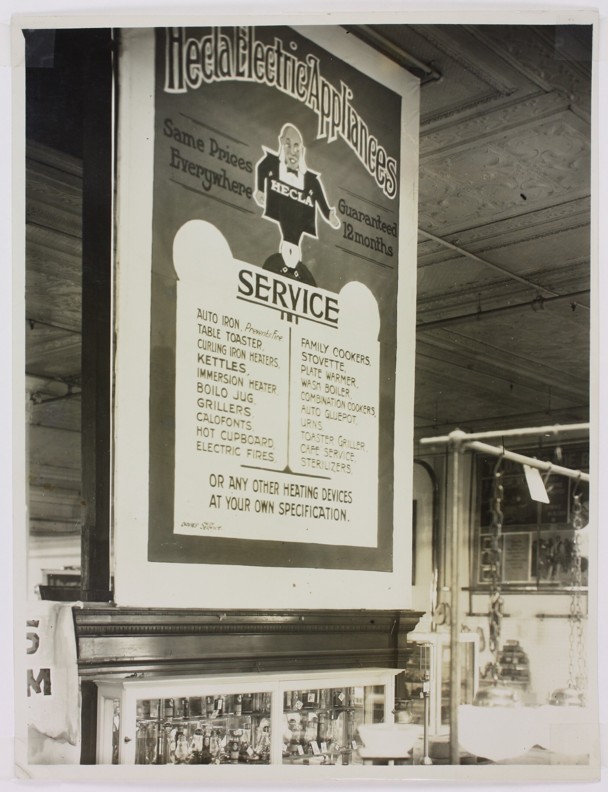 Black and white photograph of a city arcade with a sign hanging from the ceiling advertising Hecla electric appliances. A shop window is visible below on the left hand side, and the tin pressed ceiling of the arcade makes up most of the background.