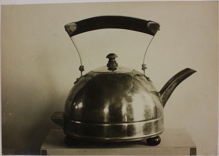 Black and white photograph of a copper 240 volt AC electric kettle with removable lid and enamel handle, produced by Hecla Electrics Pty Ltd, Melbourne, in the 1920s.