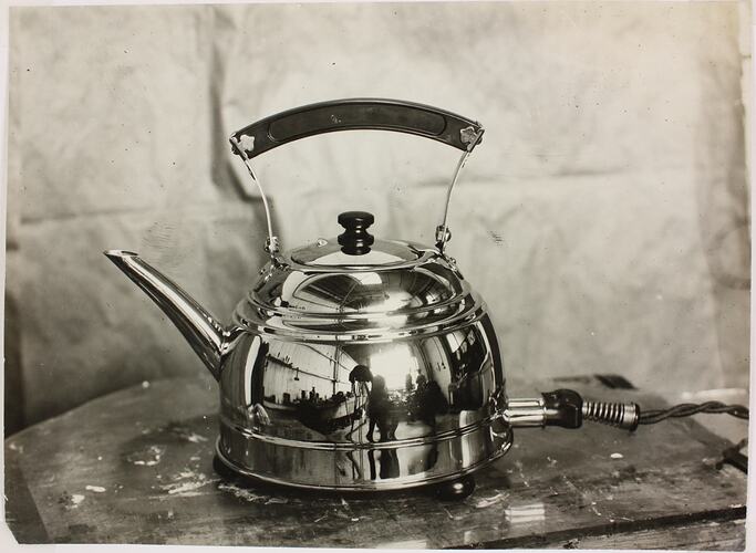 Black and white photograph of a nickel plated 240 volt AC electric kettle with removable lid and enamel handle, produced by Hecla Electrics Pty Ltd, at their South Yarra factory in Melbourne, in the 1930s.
