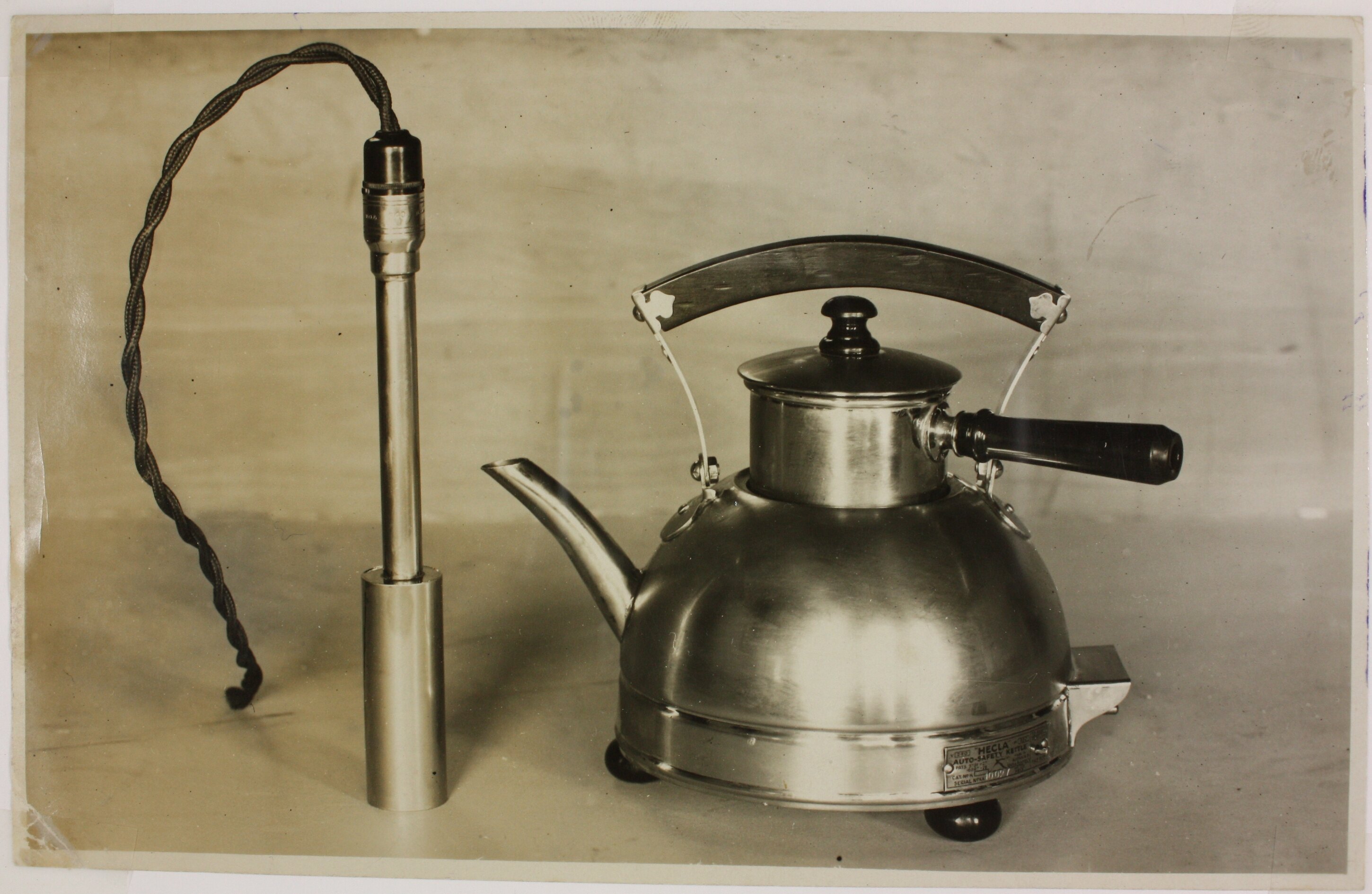 Contained within the photograph, on a metal plaque attached to the kettle: 'v240 "HECLA" / Auto Safety Kettle / Pats [3731-27] / [16597-78] / Cat No 10027 / Made in Australia'