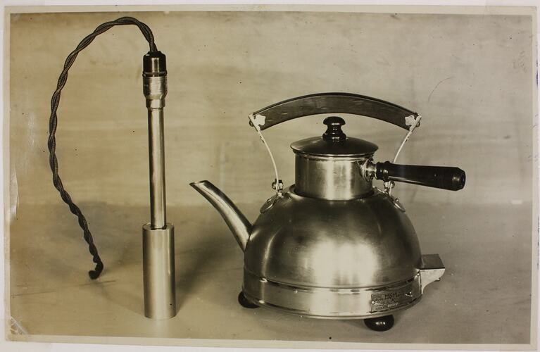 The kettle is a copper 240 volt AC electric model with enamel handle, lid and removable saucepan for heating food. It was marketed as the 'Special Kettle and Food Warmer'. The food warming saucepan rests beneath the enamel handle; when the food warmer is removed the saucepan lid fits the electric kettle.The immersion heater is finished in polished nickel plate and was advertised as being extremely economical in operation.
