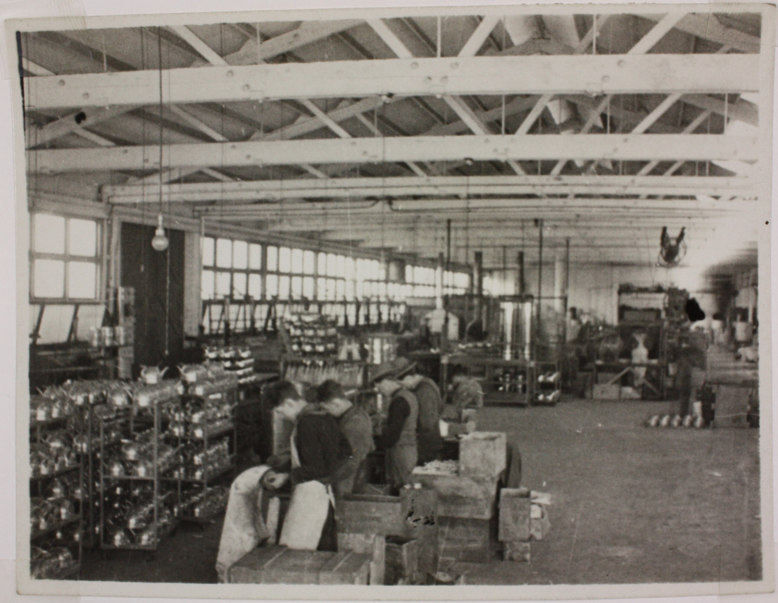 Photograph of men working in a manufacturing plant, probably in the early 1920s. The factory has simple equipment and is lit and ventilated by banks of windows along the left hand wall. The workers are engaged in production of electric kettles; in front of them are racks of partially completed kettles.