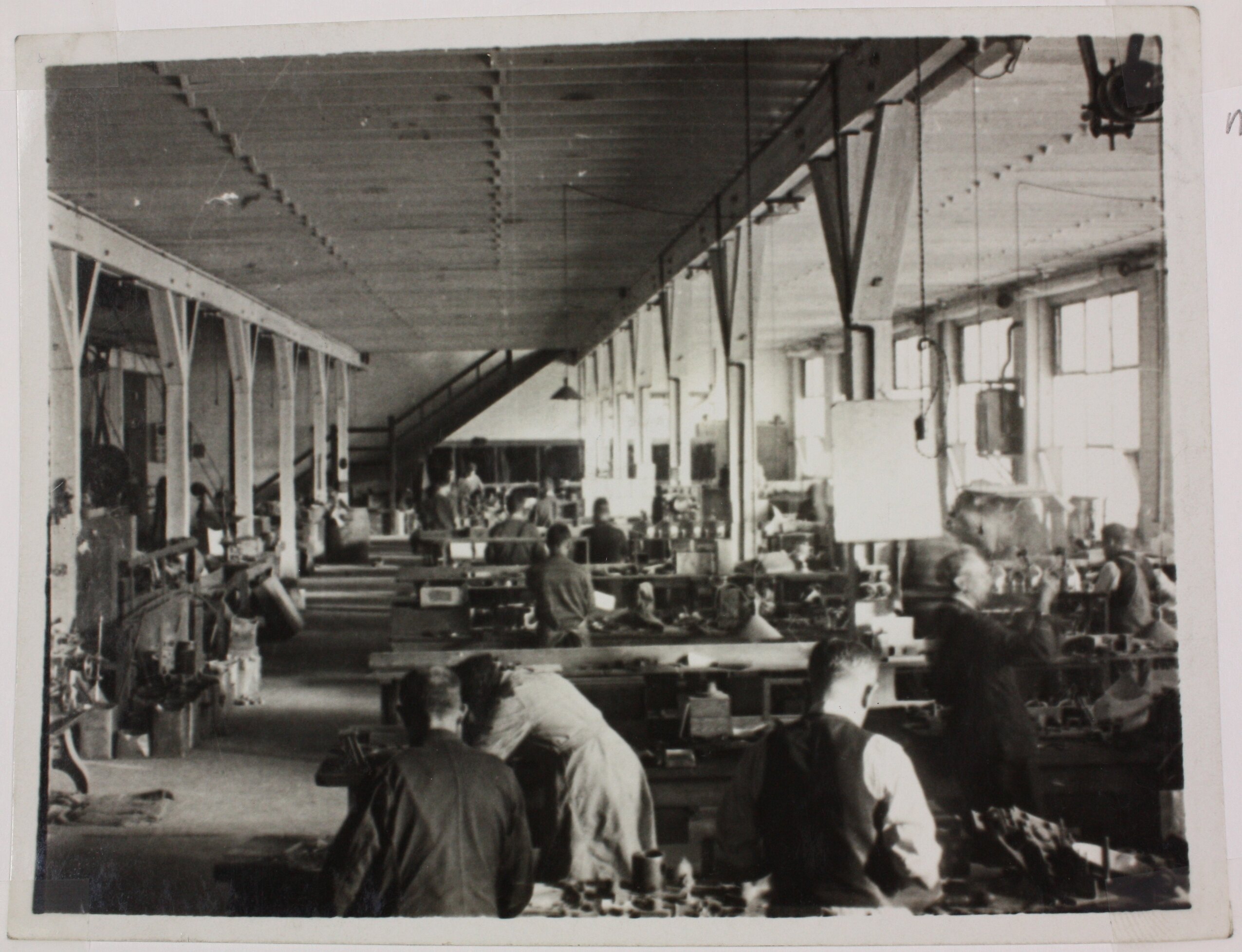 Photograph of workers assembling products at benches in an industrial setting. The image is traken from behind the workers and shows the whole factory floor.