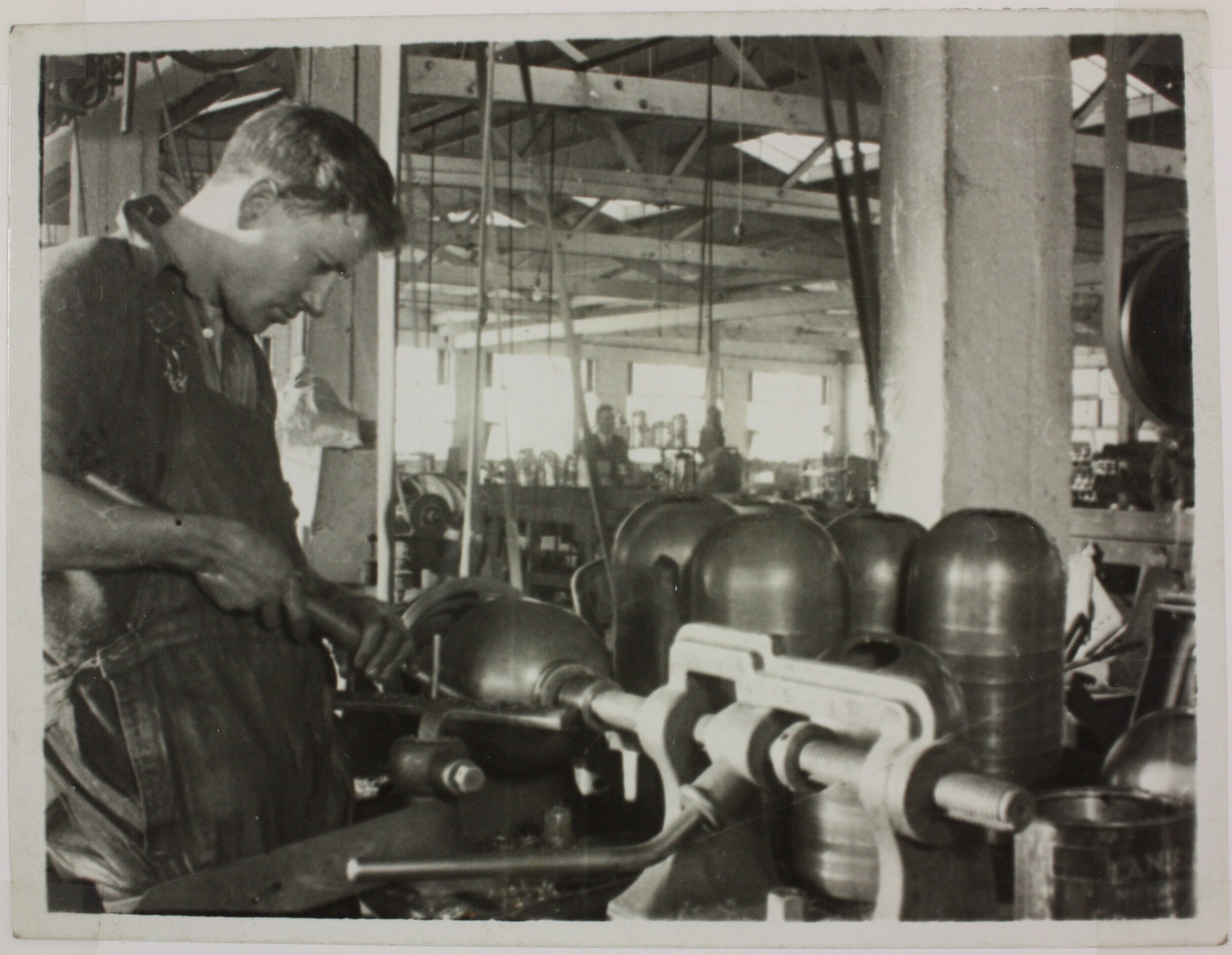 Photograph of male factory worker in overalls shaping the body component of an electric kettle. To the right of the image are stacks of kettle components. In the background two factory workers converse.