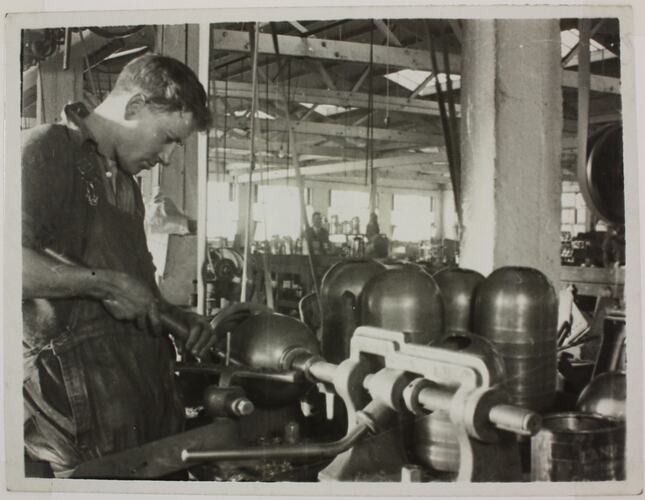 Photograph of a male factory worker shaping components of Hecla Electric Safety Kettles. The picture was probably taken at the Little Collins Street or Little Bourke Street factory premises, in the early 1920s.