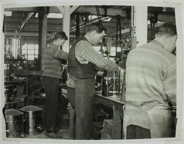 Photograph of male factory workers assembling water heaters, possibly at the Little Collins Street or Little Bourke Street premises in Melbourne. They stand at a wooden bench. Lighting is provided by skylights and windows visible in the rear of the room.