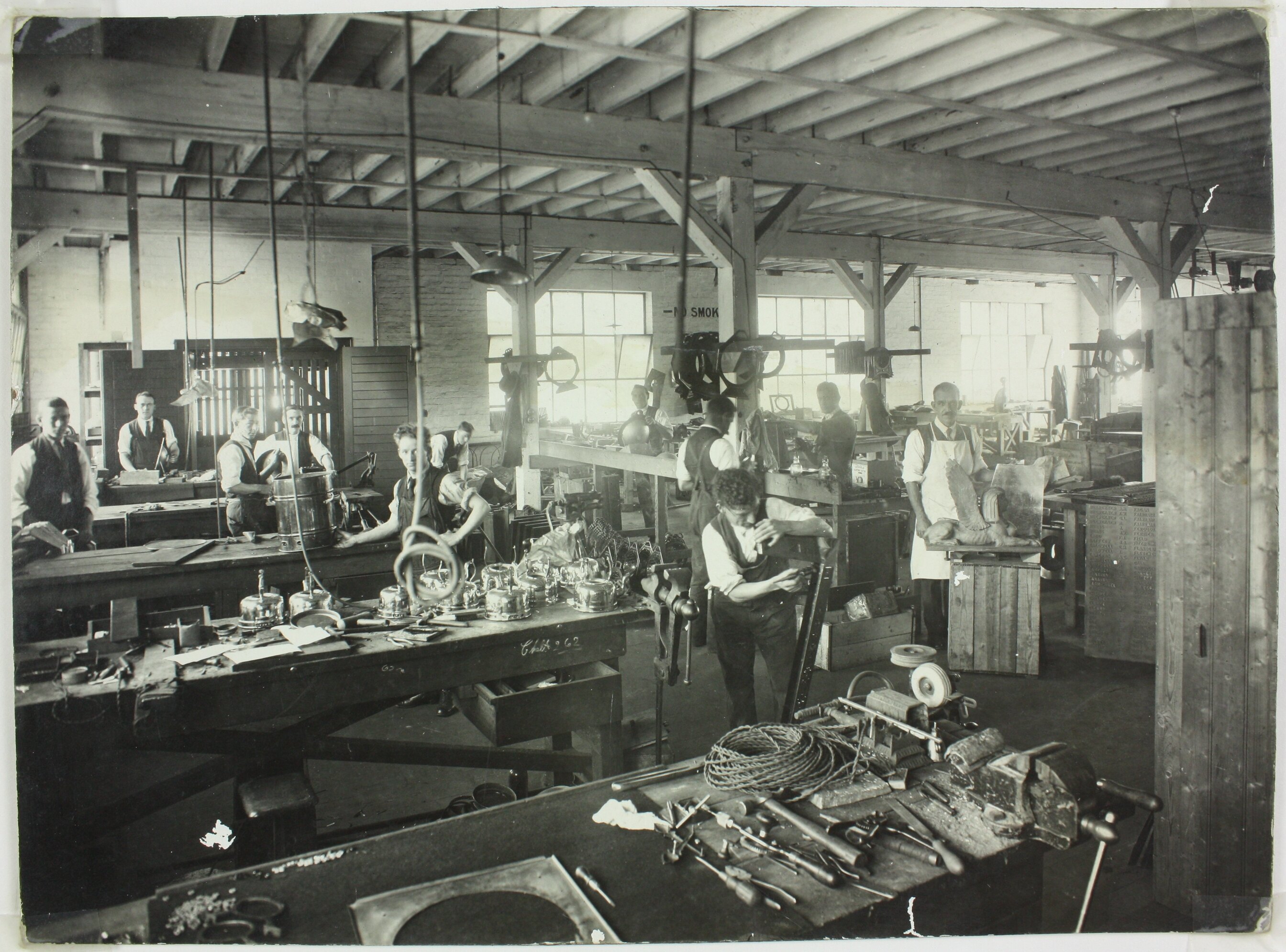 The factory room is crowded with a low ceiling. Light is provided by a bank of winnows along the rear wall, as well as electric lights suspended from the ceailing. Heavy wooden benches are positioned in rows along the room to form assembly lines. Painted on the rear wall of the room is the sign "No Smoking".