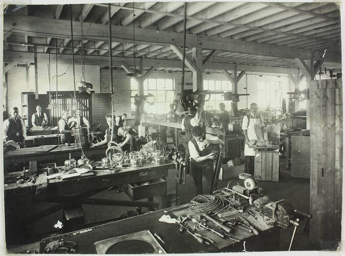 Photograph of male Hecla employees assembing electrical products, possibly at Hecla's Little Bourke Street premises in Melbourne. To the left of the image partially completed kettles and electric heaters are visible. At the right are pieces of ornamental metalwork including a winged sphinx and metal plaque of names. This suggests an early date for the photograph, as Hecla moved preogressively from decorative and art metal to domestic and industrial appliance manufacture.
