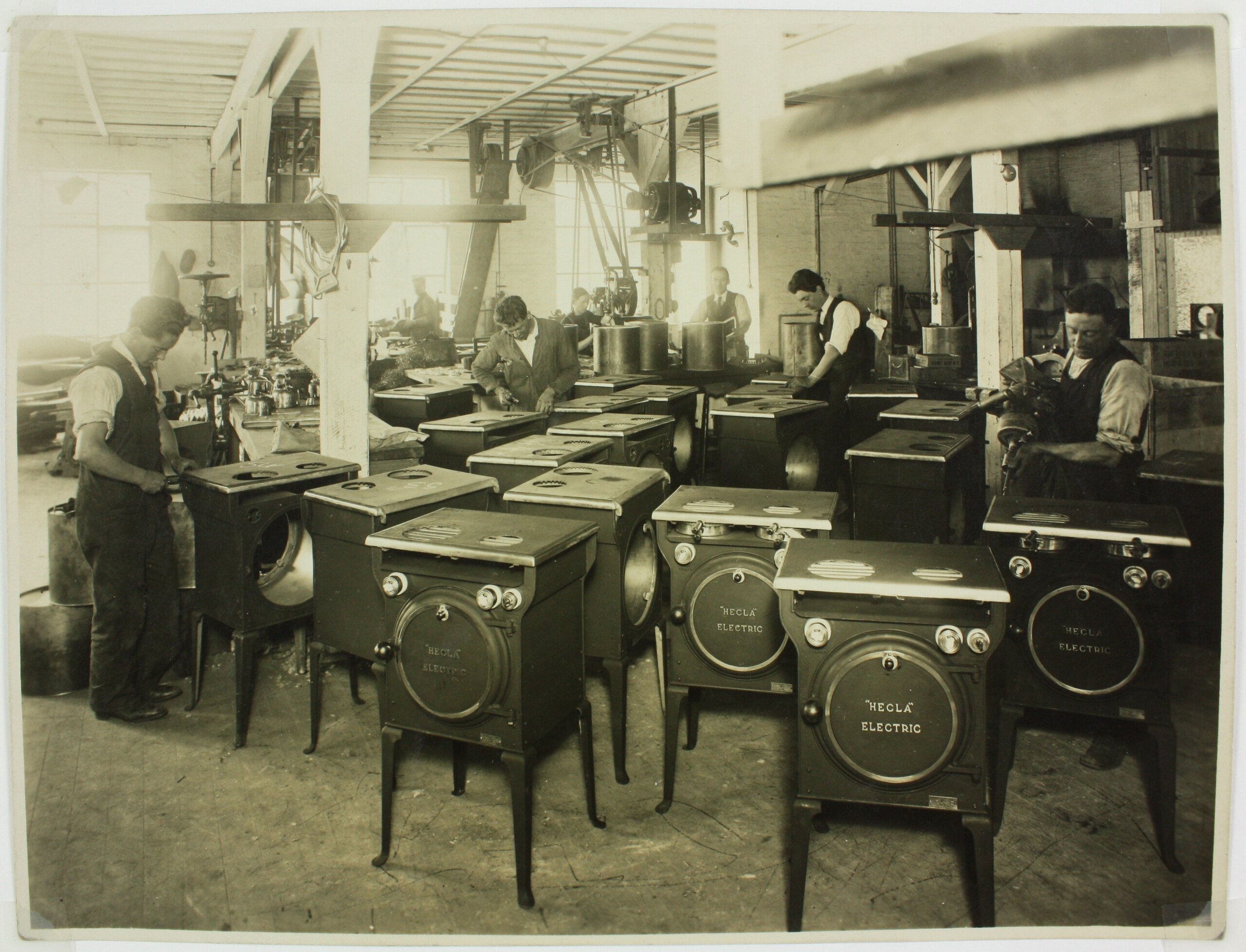 Photograph of a Hecla factory floor; workers assemble Hecla electric stoves in a crowded work space.