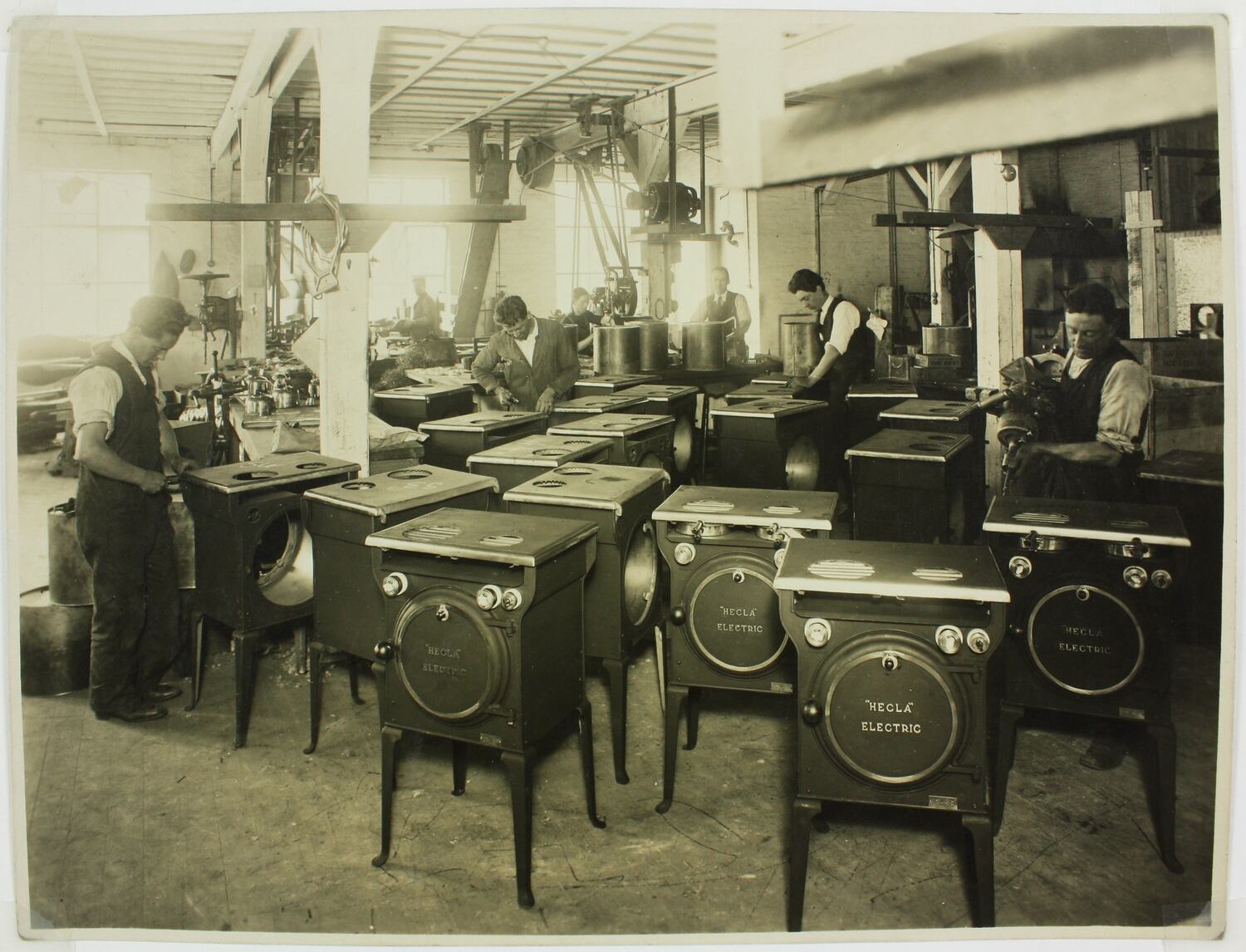 Hecla factory workers employed assembling electric stoves, possibly at the Little Bourke Street Hecla Factory in Melbourne. The floor is crowded with partially completed "Hecla" Electric Stoves of a model sold during the 1920s. It was available in either steel with enamel finish, or nickelplate and enamel.