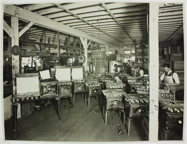 Hecla factory workers wiring switches on electric stoves, possibly at the Little Bourke Street Factory in Melbourne. The floor is crowded with partially completed "Hecla" Electric Stoves, model "B".