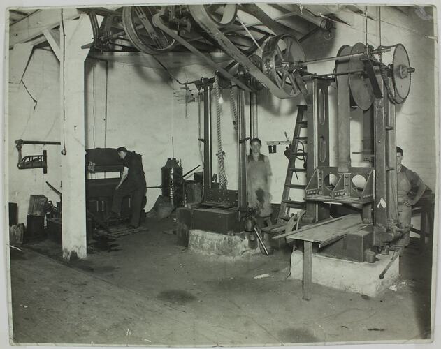 Hecla factory workers shaping metal components of Hecla products, possibly in the Little Bourke Street factory. The machinery is rudimentary and powered by a driveshaft running along the ceiling of the room.