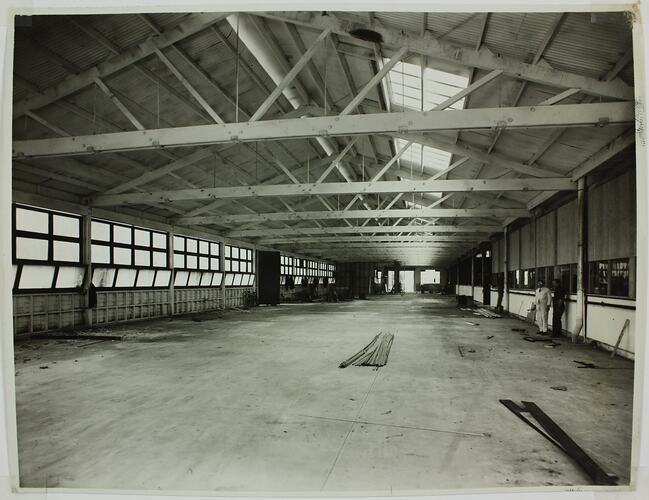 Photograph of the interior of an empty factory. The building is constructed of wood with an exposed corrugated iron roof. Planks of wood and metal poles lie on the bare concrete floor.Along the left hand side of the building are large banks of windows, on the right are smaller windows, possibly attached to offices. A row of sky lights stretches the length of the building along the right hand side of the ceiling. Three workers in overalls stand by the right wall.