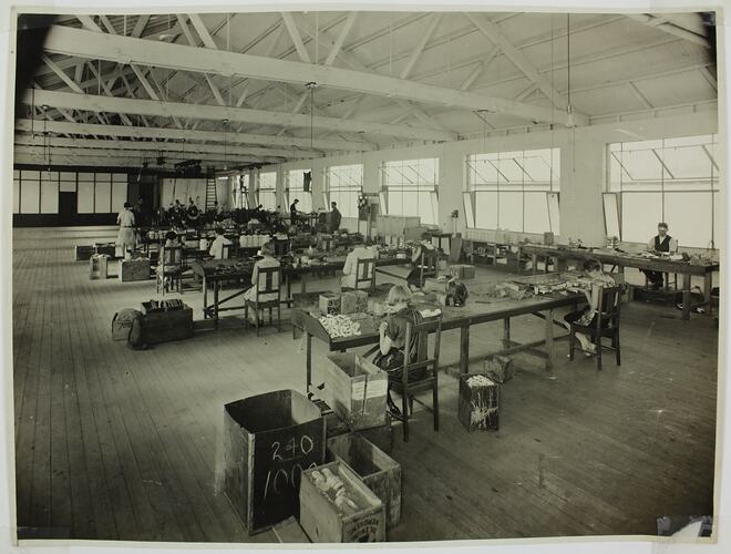 Photograph of male and female factory workers assembling Hecla products, possibly at the Little Collins Street or Little Bourke Street premises in Melbourne. The staff sit in an open factory floor with little mechanical equipment. The room is lit and ventilated by large windows along the right hand wall.