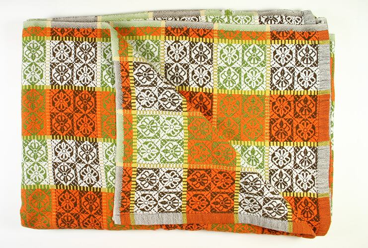 Bedspread, used at Enterprise Migrant Hostel, circa 1970s-1980s. This bedspread is an example of the standard types of basic items (towels, bedding and utensils) issued to migrants upon arrival at the hostel.