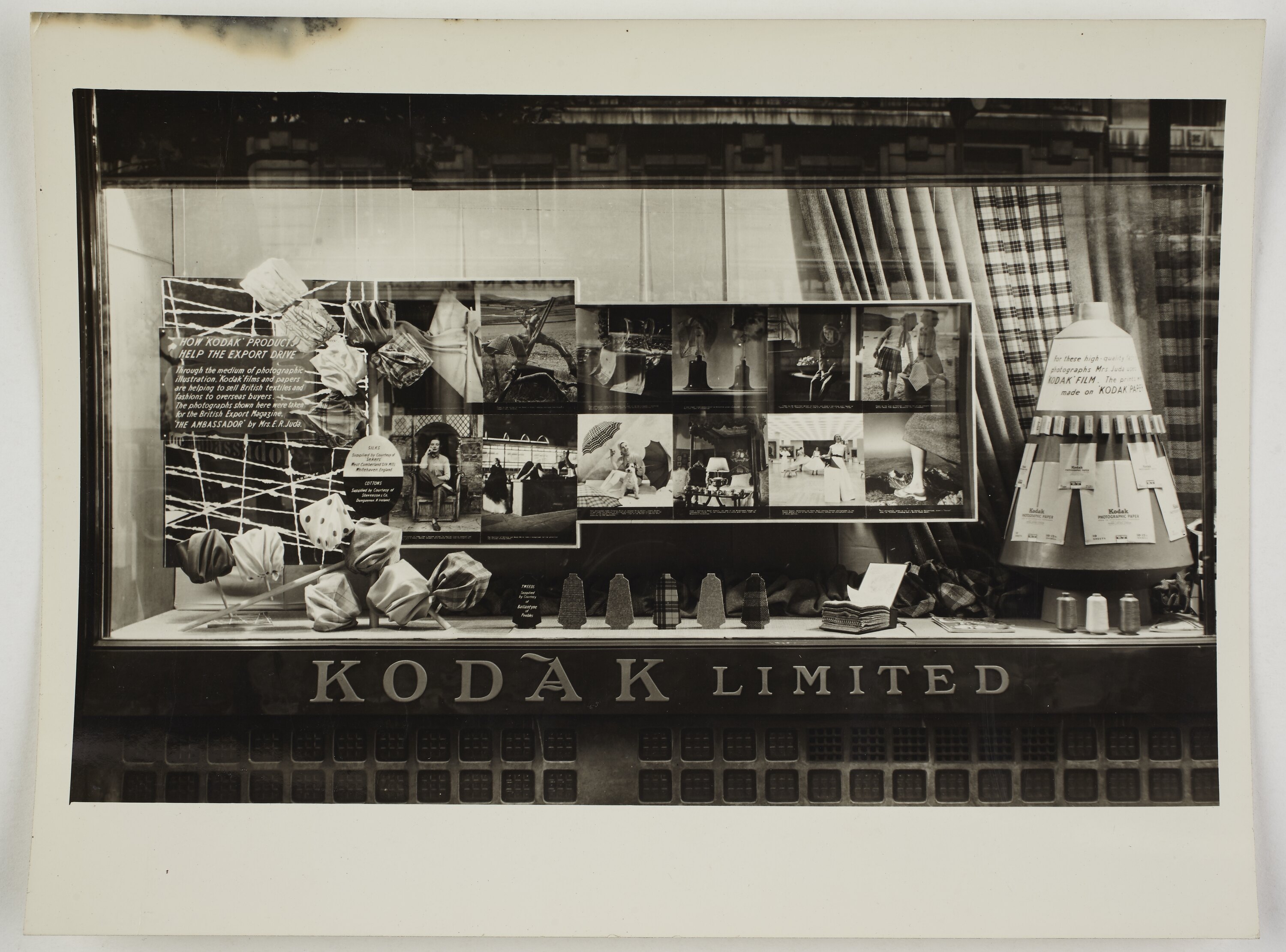 Black and white photograph of a shop front window display in a Kodak Limited retail store, circa 1930s. The display features captioned photographs taken from the British Export Magazine illustrating the theme 'How Kodak Products Help the Export Drive', with a quote from Mrs E R Juda, from 'The Ambassador'.