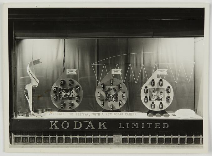 Black and white photograph of a shop front window display in a Kodak Limited retail store, circa 1930s. The display is themed around a festival, with three circular panels of cameras, each with a photograph in the centre. There is a metal hanging shape above them, like a domed tent with bunting, and a ribbon shaped sign runs across the floor of the display which reads: 'Celebrate the Festival with a New Kodak Camera'.