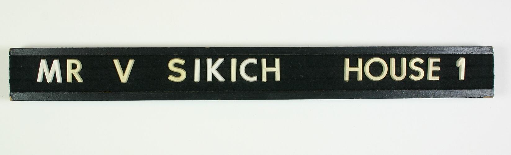 Inscription: 'Mr V SIKICH HOUSE 1'