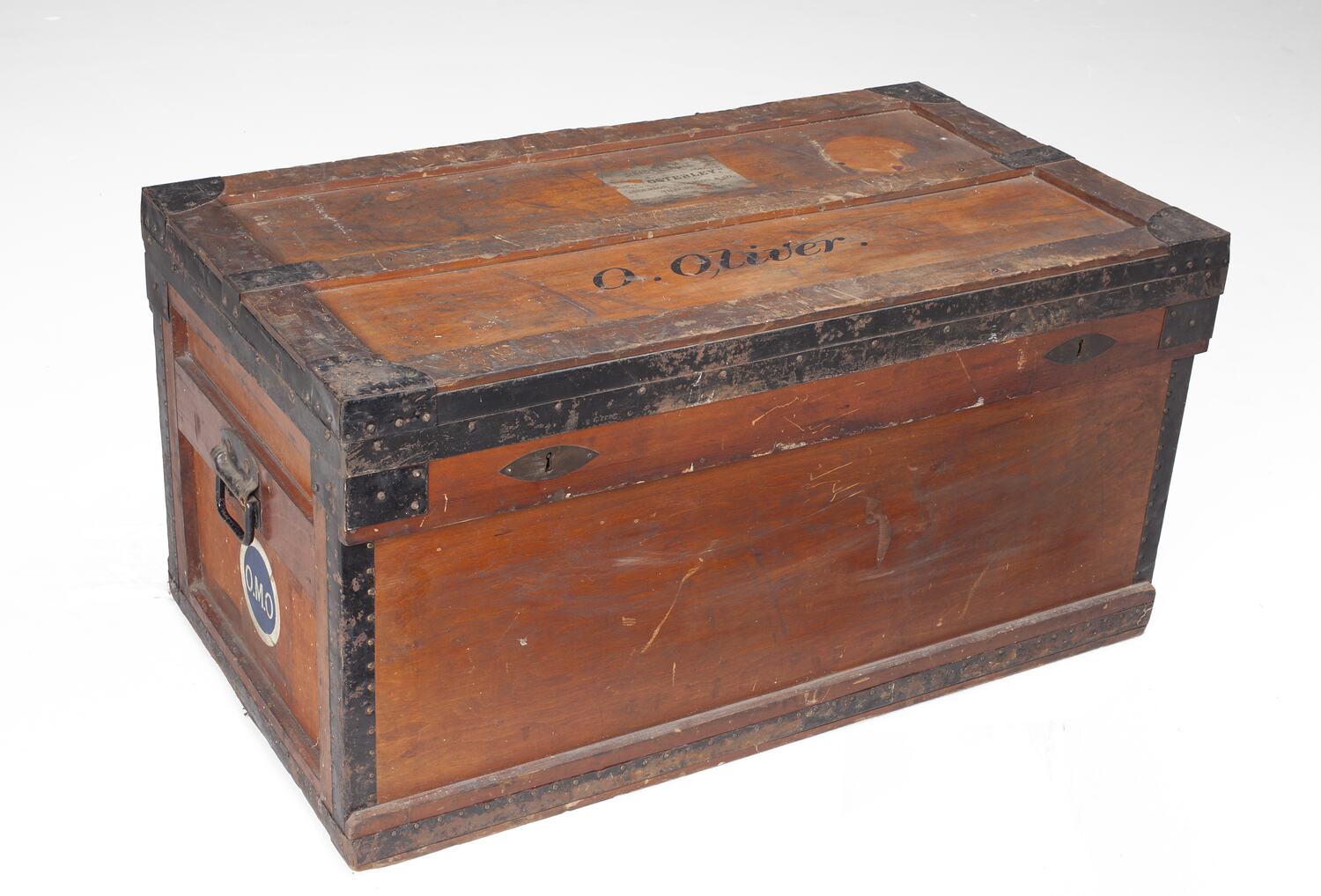 Printed on Orient Line label: S.S. Osterley / to the care of / Anderson. Anderson & Co., / Tilbury Dock, / Essex'. Marked on top of the chest in large black cursive script: 'O.Oliver.'