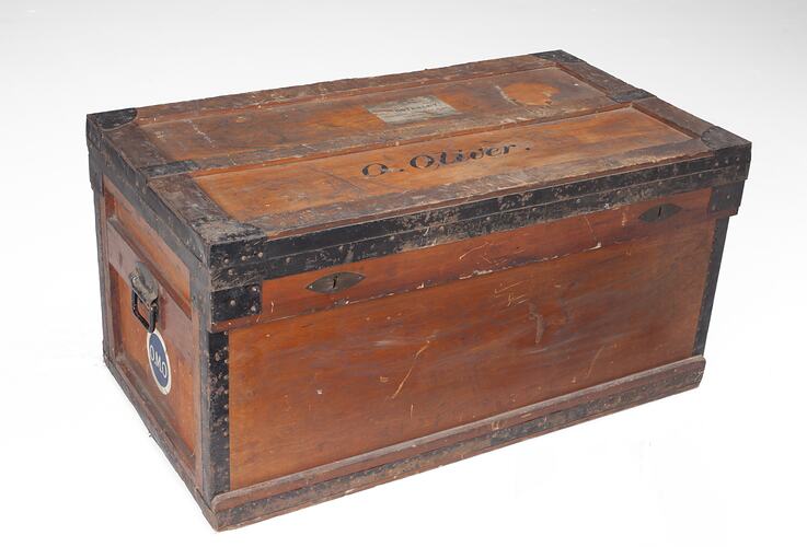 Wooden sea chest that Miss Olive Oliver used during her round-the-world tour of the United States of America, Britain and Europe in 1911.