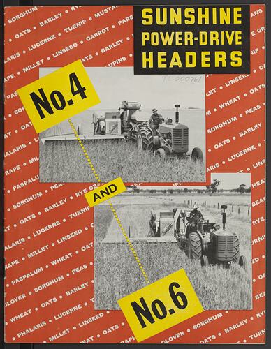 Sales brochure for Sunshine Power-Drive Header Harvesters, focusing on the No.4 & No.6 models. Both models were improvements on the original Header Harvester. As an innovative company, following on from the vision of H. V. McKay, they prided themselves on producing the latest technologies.