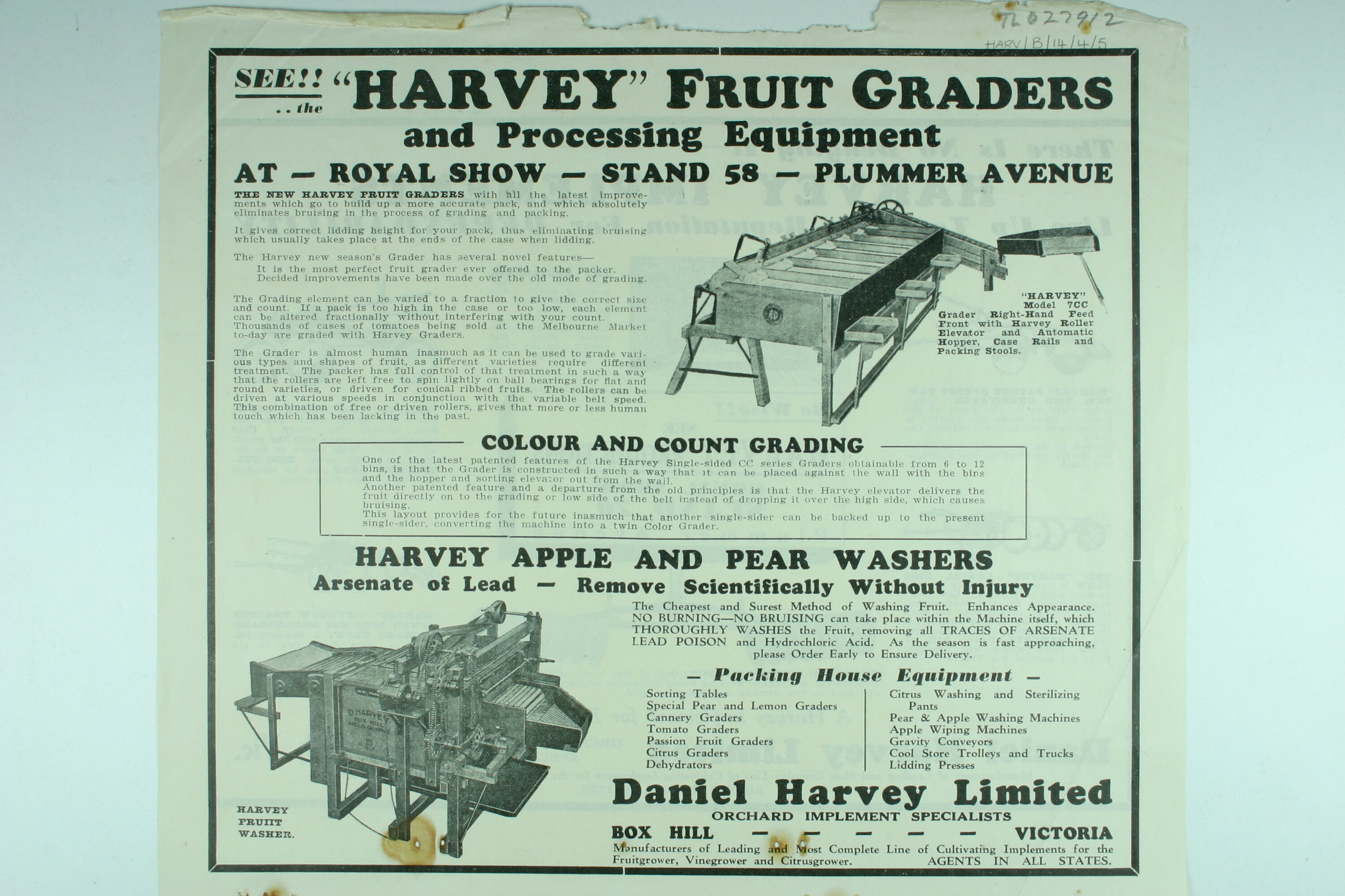 Part of a collection of photographs, artefacts and trade literature relating to Daniel Harvey Pty. Ltd., agricultural implement manufacturer, Box Hill, Victoria.