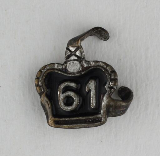 Small, metal, crown-shaped tag found inside a Princess Mary's Christmas Gift tin. The tag is similar to the type of tag or tab found on a badge of the Returned Sailors' Soldiers' & Airmen's Imperial League of Australia or RSSILA (refer to object HT 21024). It appears that badges may have been made in bulk and the appropriate year of membership was added on top using the tag. In this case, '61' apparently refers to 1961.