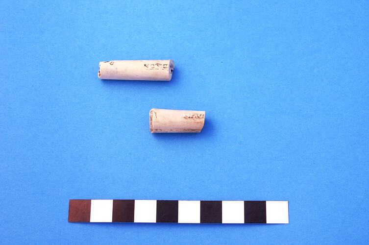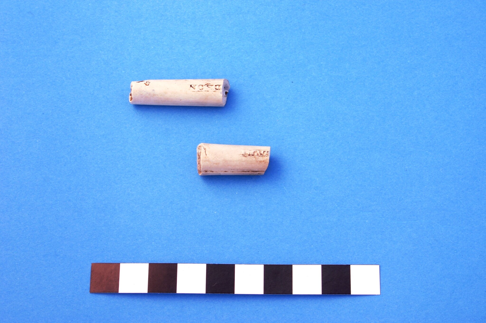 Two conjoining fragments of clay pipe stem. Stem is undecorated but has 'Davidson' & 'Glasgow' impressed. Manufactured by Thomas Davidson of Glasgow between circa 1861 and circa 1891. Davidson may have produced pipes almost exclusively for the export trade.