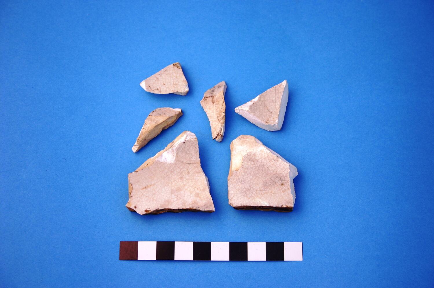 Six partially refitting thick, white-glazed earthenware fragments of a large circular or oval item, probably a platter. The edge has a moulded scroll design that is typical of 'White Granite', although it is low-fired earthenware. Manufactured between the 1840s and circa 1930.