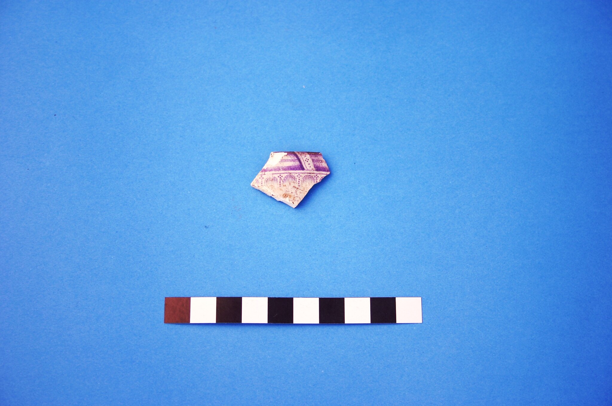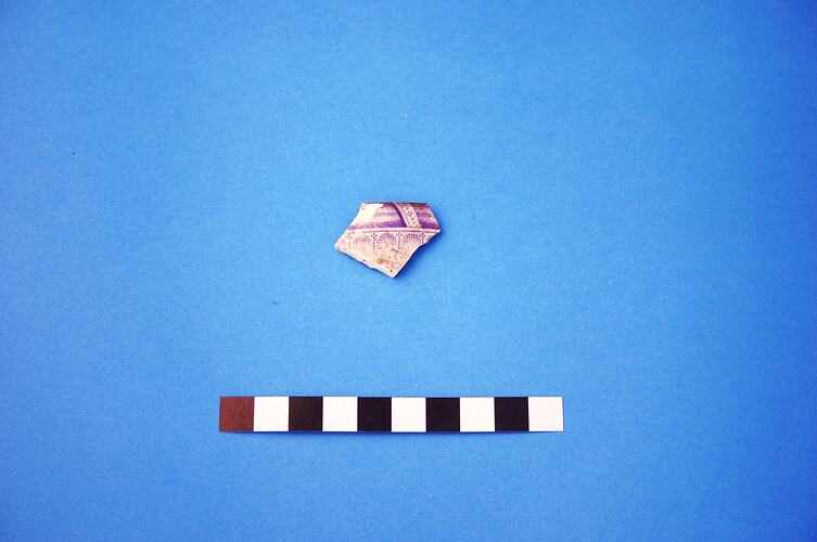One earthenware rim fragment from a cup or mug. Decoration is violet transfer print in an unidentified pattern. Manufacture date is circa 1814 to circa mid-20th century.