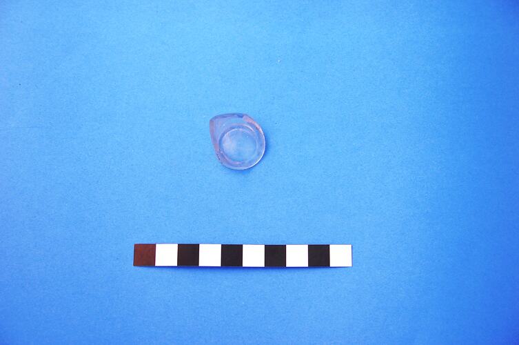 One complete base of a small (25.3mm diameter) glass bottle, probably a medicine or perfume bottle. The bottle has been manufactured in a multi-part mould with a separate base plate. Small maker's mark 'HP' moulded on side near base. Date range of manufacture from about mid-19th century to circa 1900.