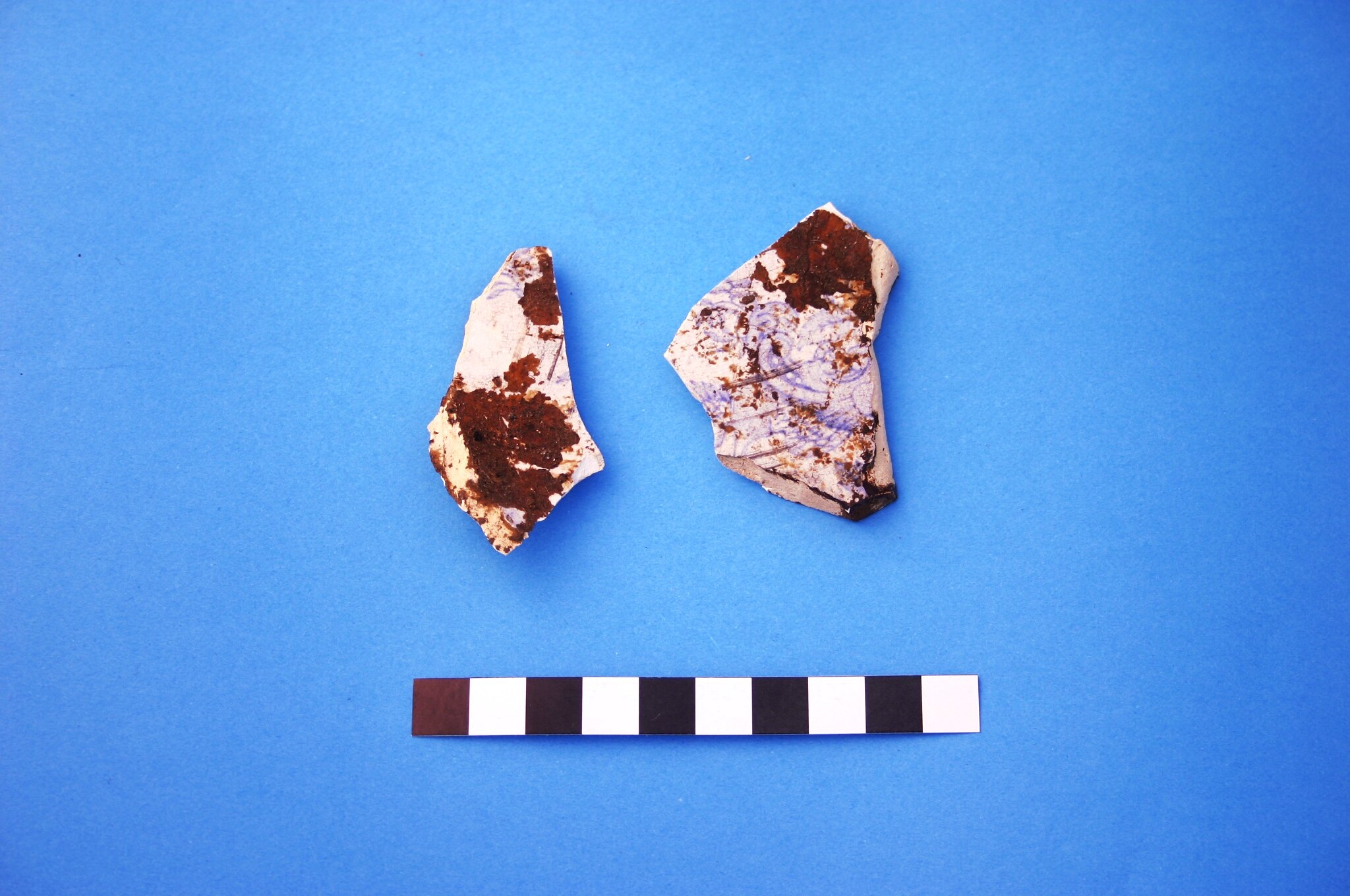 Two conjoining fragments of an earthenware plate base. Transfer print is blue 'Asiatic Pheasants', popular in the second half of the 19th century and into Edwardian times.